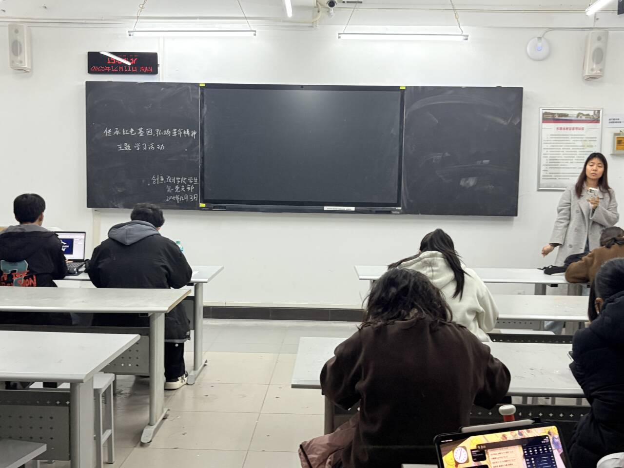 “革命精神研讨”环节,师生围绕“不同历史时期的革命精神,对当代青年有何启示”展开交流。教师党员、环境设计专业的李老师谈到:“井冈山精神中的‘敢闯新路’,放在今天就是我们在专业领域的创新精神——比如我们做乡村设计,不能照搬城市模式,要结合乡村实际‘闯’出适合村民的新方案。”学生党员结合自身参与的“红色景点VR项目”分享:“长征精神中的‘百折不挠’,让我在项目遇到技术难题时没有放弃——反复调试了30多次,终于做出了能让观众‘沉浸式’体验长征场景的VR作品,这就是革命精神给我的力量。”