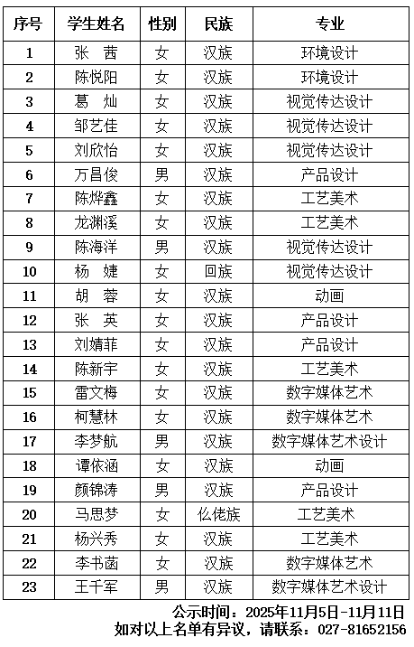 武昌理工学院创意设计学院2025年国家励志奖学金名单公示
