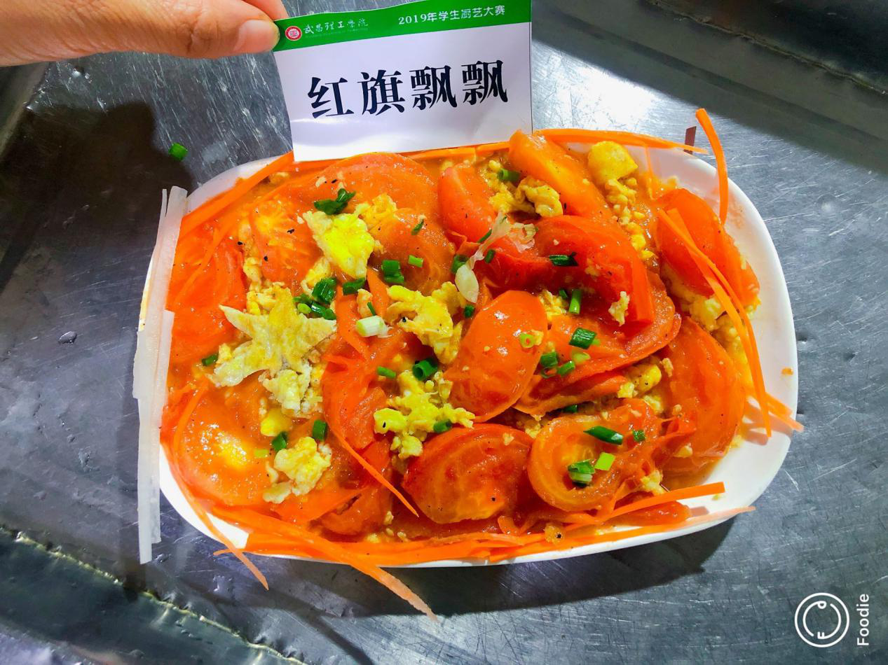 不一会儿,艺术设计学院学生组的的菜香四溢的可乐鸡翅、香飘十里的金针菇肥牛、和原汁原味的武昌鱼,以及教师组的“红旗飘飘”、“追求卓越”、“不忘初心”六道菜就摆在了评委面前。“红旗飘飘”是用番茄和鸡蛋两种简单食材烹炒,经过精心摆盘,最后呈现出一幅“五星红旗”图案的菜品,“追求卓越”则是将鹅翅焖熟,配以鸭翅、鸡翅,寓意展翅腾飞,追求卓越,“不忘初心”则是清蒸玉米、胡萝卜、红枣、西兰花四种食材,还原食物的本味,寓意返璞归真,铭记一路走来的艰辛,不忘初心,珍惜当下美好生活。