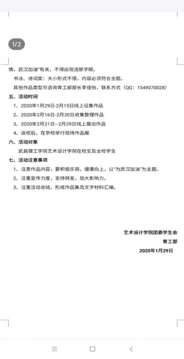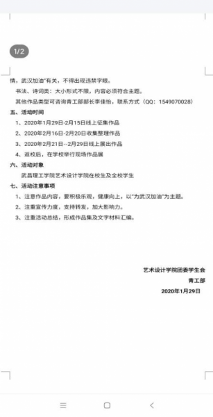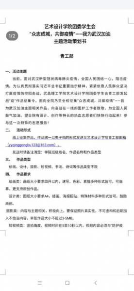 这是一次特殊的志愿活动,作为雏鹰圆梦社长的李佳怡连夜构思策划并与常委进行交流修改。本来大家都是放假在家,但是接到任务后都积极的开始工作。经过三天的时间,最终在艺术设计学院团委书记李婷书记的指导下,此次活动的最终策划终于定稿,活动开始正式实行。本次活动主要以线上收集与抵抗疫情相关的作品为重点,希望作为艺术设计学院的同学,可以发挥自己的特长为一线的工作人员加油,为武汉加油,为中国加油。