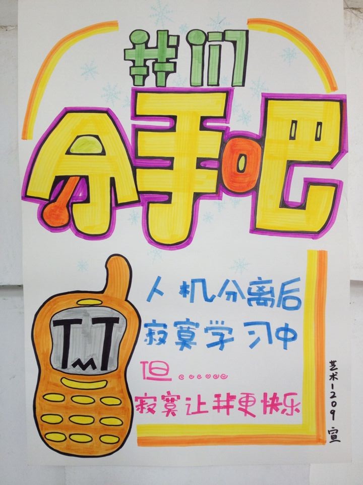 为了进一步宣传“人机分离”的管理制度,营造良好的学习氛围,让更多的同学易于接受和理解该项制度并在平日的课堂中执行,武钢老师将学校正在推行的“人机分离”制度带入课堂教学环节中,指导艺术1208、1209班的学生设计创作了一幅幅别开生面的POP宣传海报。每幅海报均以POP字体为载体,再用动漫人物将一句句宣传口号生动萌化的展现出来,更容易让人产生认同感,给人耳目一新的视觉感受。