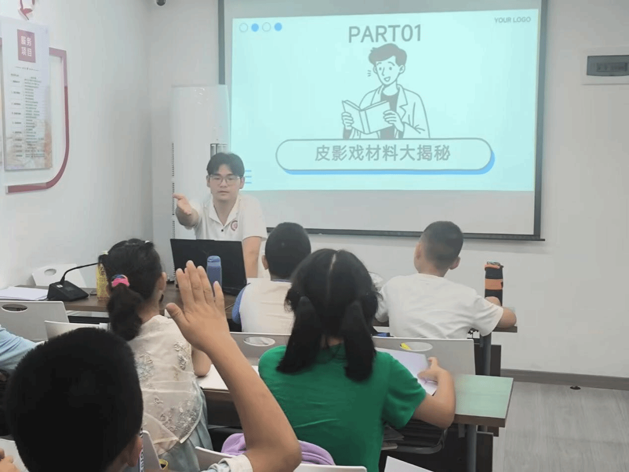 课程开始,实践小队成员通过播放精彩的皮影戏表演视频,迅速吸引了孩子们的目光,将他们带入了神秘的皮影世界。视频中,栩栩如生的皮影人物在光影交织中演绎着精彩故事,独特的艺术魅力让青少年们惊叹不已。随后,成员们用生动易懂的语言详细讲述了皮影戏的历史起源、艺术特色以及制作工艺。从皮影戏如何诞生于两千多年前的西汉时期,到其在唐宋时期的繁荣发展,再到如今作为国家级非物质文化遗产面临的机遇与挑战,青少年们听得津津有味,对皮影艺术有了初步的了解和认识。