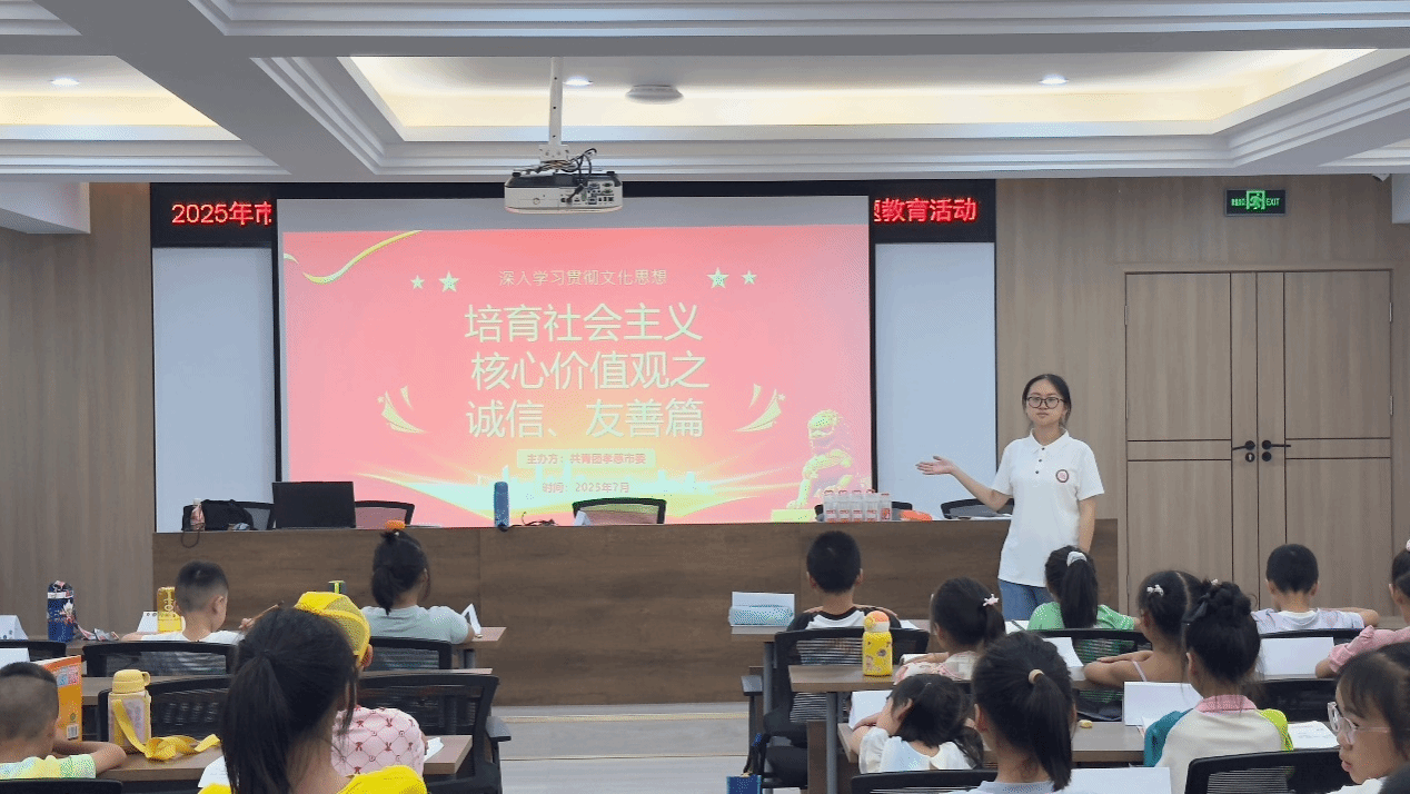7月10日消息(通讯员 阮颖 报道)为引导未成年人从小树立正确价值观,让社会主义核心价值观在孩子们心中扎根。7月10日,孝感市丹阳办事处东苑社区的活动室内传来阵阵欢笑,武昌理工学院创意设计学院“雏鹰圆梦”美育教育暑期社会实践团队的志愿者们正通过生动有趣的互动,为社区小朋友们开展“培育社会主义核心价值观”主题课堂,其中“诚信”与“友善”成为当天的重点内容。