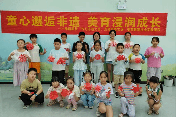 活动中,孩子们的作品虽稚嫩却充满真情:有的剪了邻里互助的场景,有的刻了国旗与和平鸽,还有的把楚绣纹样与剪纸结合,创作出独特的“文化融合”作品。当孩子们举着作品合影时,实践团队成员刘瑞霞趁机提问:“剪这些图案时,大家想到了什么?”孩子们七嘴八舌地回答:“要爱家乡”“要学好人”“要保护传统文化”,朴素的话语道出了课程的深意。