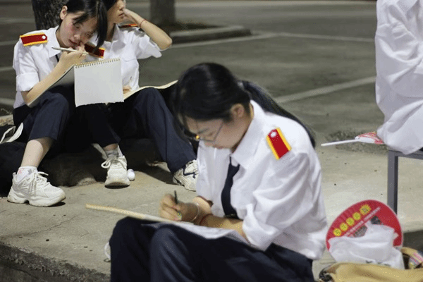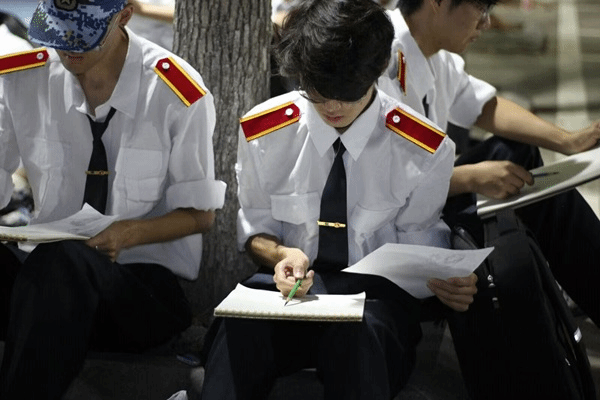 操场的侧道旁,观训的学生并肩而坐,速写本摊开在腿间,笔尖在纸上不停游走。有人专攻动态捕捉,用简洁的线条勾勒出同学踢正步时的腿部弧度;有人侧重细节刻画迷彩帽细细描摹,帽徽的纹路、布料的褶皱都清晰可辨;还有人不时抬手擦汗,指尖蹭上的炭粉在迷彩服上留下淡淡的灰印,倒让专注的模样更添几分生动。