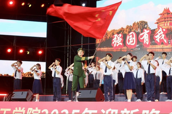 当“强国有我”的醒目字样出现在背景大屏,一位身着军装的同学有力挥舞着五星红旗,演员们以饱满状态参与其中,或朗诵或歌唱,声音洪亮、眼神坚定。那一面飘扬的红旗,那一句句充满力量的誓言,展现出新时代青年“强国有我”的担当,将现场氛围推向顶峰。