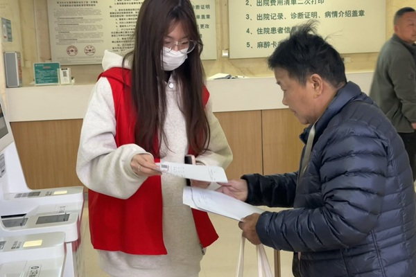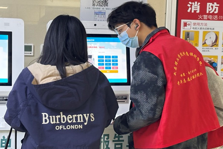 快速熟悉了门诊布局、自助设备操作流程、就诊引导规范等内容。大家分工协作,分布在自助挂号机、咨询台、候诊区等关键点位,全方位开展志愿服务。在自助服务区,面对老年患者、外来务工人员等对智能设备操作不熟悉的情况,志愿者们俯身示范、手把手教学,从挂号缴费、检验报告打印到医保凭证获取,一步步耐心讲解,帮助群众跨越“数字鸿沟”;遇到患者及家属,志愿者们主动上前安抚,细致指引科室位置、告知候诊注意事项,用温和的话语缓解他们的紧张情绪;在人流密集区域,志愿者们协助维持秩序,引导大家有序排队,保障就诊通道畅通。