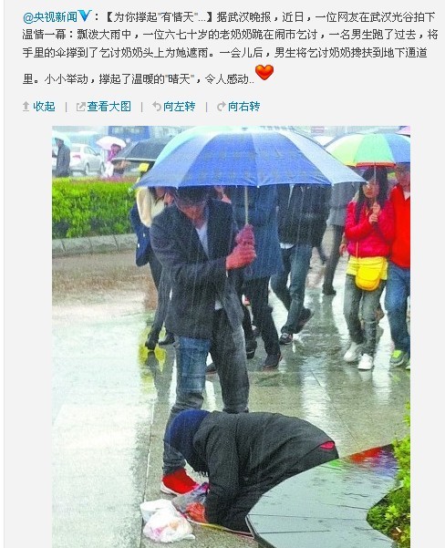 3月16日上午,网友小刘在经过武汉光谷步行街人行通道附近时,见一位年龄六七十岁的老奶奶正跪在闹市乞讨,当时下着瓢泼大雨,老人头上都是水,地上摆着个碗,里面只有几枚零钱,十分可怜。正当他在心里感慨时,一位学生模样的男生从后面快步跑来,将手里的伞撑到乞讨奶奶头上,又蹲下来和老人说了什么话。一会儿后,男生搀扶着乞讨奶奶到地下通道里坐着。他目睹这一幕,拍下发到微博上。由于雨太大,他没看清男生的正脸,但男生扶着老人的背影,让他心里特别温暖。微博发出后,男生行为受到网友的赞誉。网友“wendy”说:“一把小小的雨伞撑起的一片‘情’天,武汉真是个有爱的城市,希望更多的爱在这个城市上演。”