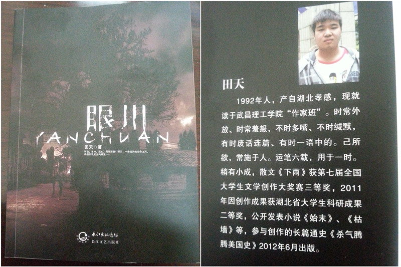 小说以冷凝的文字、魔幻的手法描绘了一个充满悬疑的象征世界,主人翁“眼川”因妹妹生病从大城市回到村中,在封建传统的祭祀制度下,出现了重重悬疑,引人入胜。田天的指导老师汉语言文学系主任龚义成老师在阅读完全部原稿后评说:“田天超越了他19岁的心理,文本中看不到19岁这个年龄常常表现的肤浅和生涩。文字常常让人读了有种惊悚的感觉,大有川端康成那种‘新感觉派’的风格。”他认为,《眼川》是一部比较成熟的原创小说,在这个年龄段能写出这样的作品真是难能可贵。