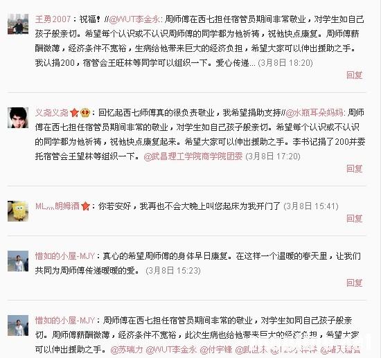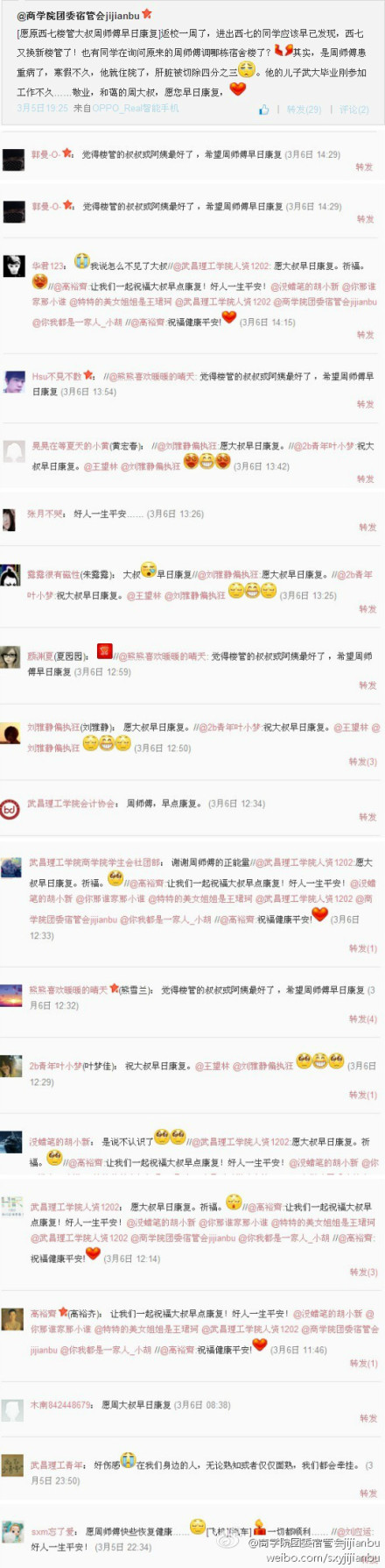 “周叔在岗期间尽职尽责,如今西七少了他,我们都十分想念。祝愿周叔早日康复,我们在武昌理工等着你。”、“一份温情感动着身边的所有人,是周叔的微笑温暖着身边的我们,是周叔的尽职尽责让大家少了寒风中的等待,愿周叔早日康复!”、“真心的希望周师傅的身体早日康复。在这样一个温暖的春天里,让我们共同为周师傅传递暖暖的爱。”、“周师傅,要好好照顾自己,快些好起来,我们都想你!!”……同学们的祝福传递到整个武昌理工学院,很多同学都跟帖表达自己的祝福,希望周师傅早日康复。