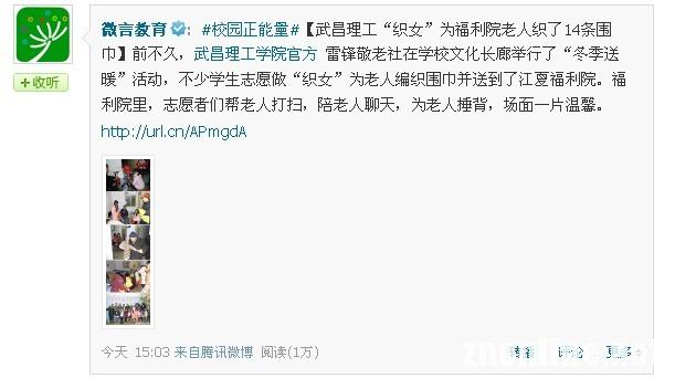 教育部新闻办公室官方微博“微言教育”在其新浪和腾讯官方微博中写道:前不久,武昌理工学院雷锋敬老社在学校文化长廊举行了“冬季送暖”活动,不少学生志愿做“织女”为老人编织围巾并送到了江夏福利院。福利院里,志愿者们帮老人打扫,陪老人聊天,为老人捶背,场面一片温馨。微博同时配发了相关图片5张,迅速引发网友热议和称赞。仅在其腾讯官方微博上,该微博就点击超2万次,转播评论30余条。网友们纷纷评论竖起大拇指,网友“魏志祥”评论说“这是社会正能量啊”,网友“宋玉珍”表示: 爱心于天下,何不和谐社会,阿弥陀佛。