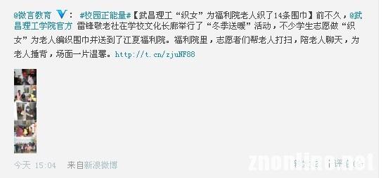 中南在线消息(记者 鲁信 报道)1月8日,教育部新闻办公室官方微博“微言教育”在#校园正能量#微话题中刊发了武昌理工学院“织女”为福利院老人织了14条围巾的敬老事迹,转发评论众多,点击量达数万次,引发网友热议。