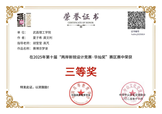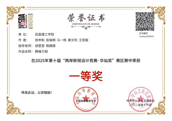 华灿奖由中国高等教育学会、中华中山文化交流协会联合主办,秉持“以赛促育、以赛促融、以赛促创” 核心理念,是覆盖两岸暨港澳地区的设计类权威赛事。赛事不仅聚焦艺术设计创新成果展示,更肩负着引导青年树立正确三观、深化文化认同、铸牢中华民族共同体意识的使命,同时倡导设计理念、技术与材料的创新应用,推动成果转化与产教融合,以设计创新赋能新质生产力发展。这一导向与武昌理工学院创意设计学院的育人目标高度契合,师生紧扣赛事主旨,从中华优秀传统文化中汲取灵感,用数字技术赋予传统符号新生命力,最终在众多参赛作品中脱颖而出。