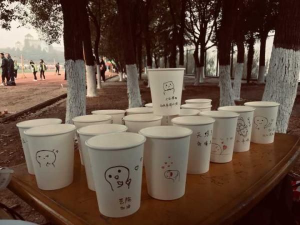 在比赛进行之际,穿着醒目红色马甲的艺术设计学院“雏鹰·圆梦”志愿者团队们拿出了提前准备好的一次性纸杯“加油你是最棒的!”“艺院最棒,冲鸭!”等祝福的言语,这些都是由志愿者们亲手绘制而成,在比赛开始的前一天,志愿者们就开始准备各项物品,他们自发的组成了一只团队,为学校他们自费购买了一次性水杯、热水瓶、葡萄糖和餐巾纸等一系列物品,又熬夜在每一个纸杯上写下又或画下祝福的话。