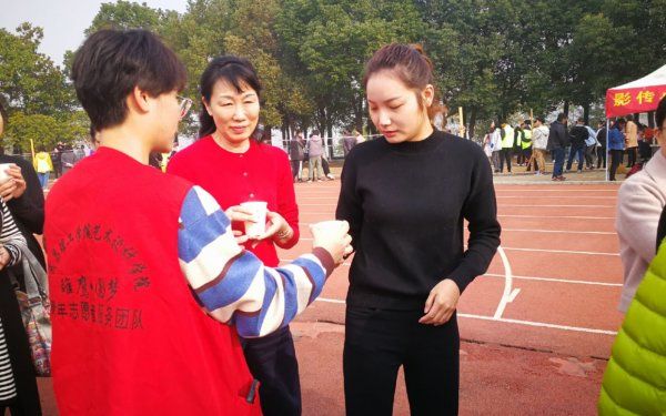 一个个水杯,不仅代表了志愿者们对教职人员由衷的祝愿,更体现了武昌理工学院学子尊师重教的优秀传统美德,这份温暖的心意不单只提供给艺术设计学院的老师,还提供给每一位参赛选手。在铅球比赛开始前,比赛老师排成了长龙,志愿者将一杯杯温暖的热水,传递到了每一位老师的手中,老师们也在收到祝福后鼓足了力气,充满了信心。