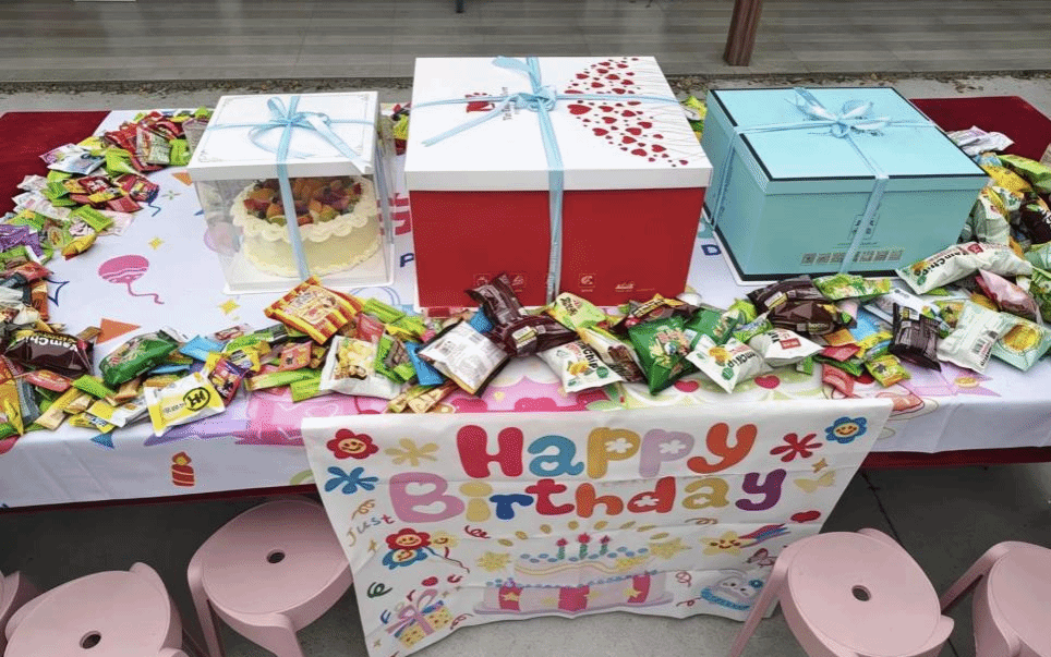 活动现场布置温馨,缤纷的气球、印着“Happy Birthday”的主题桌布、色彩鲜亮的零食台与精致的生日蛋糕相映成趣,主题签到板上写满了师生们的祝福,处处洋溢着青春的活力与生日的喜悦。创意设计学院的学生干部们早早抵达现场,有条不紊地开展布置、接待引导工作,为生日会的顺利开展保驾护航,用细致周到的服务迎接每一位师生的到来。